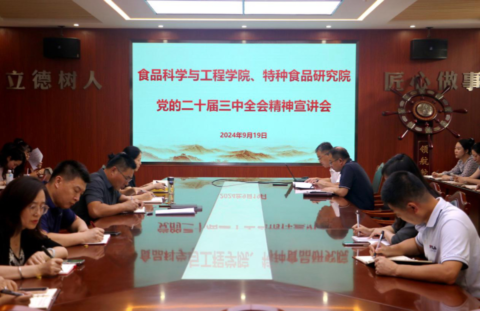 为深入学习宣传贯彻党的二十届三中全会精神,进一步统一思想、凝聚力量,9月19日,beat365在线体育官网、特种食品研究院在食品楼310召开党的二十届三中全会精神宣讲会,学院党委书记车广杰向全体教职工做党的二十届三中全会精神宣讲。