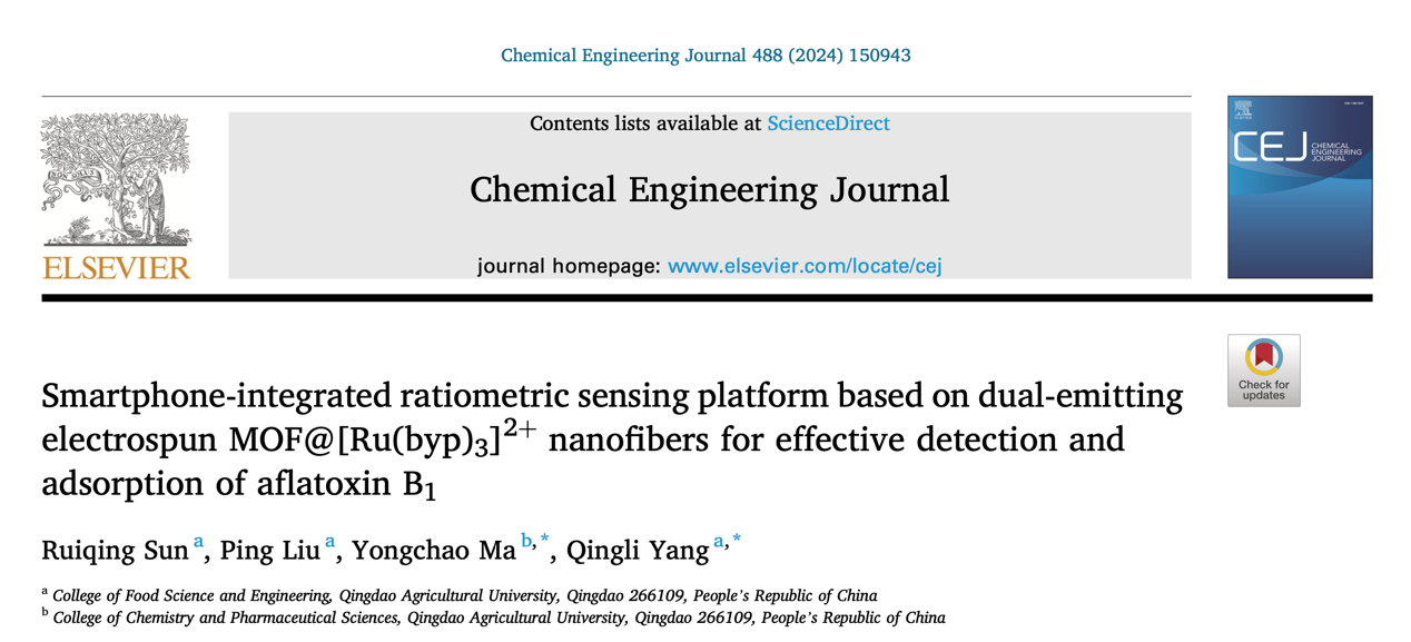 beat365在线体育官网杨庆利教授团队在国际TOP期刊Chemical Engineering Journal(IF:15.1)发表了题目为“Smartphone-integrated ratiometric sensing platform based on dual-emitting electrospun MOF@[Ru(byp)3]2+ nanofibers for effective detection and adsorption of aflatoxin B1”(基于双发射MOF@[Ru(byp)3]2+静电纺丝纳米纤维的智能手机集成比率传感平台有效检测和吸附AFB1)的研究论文。