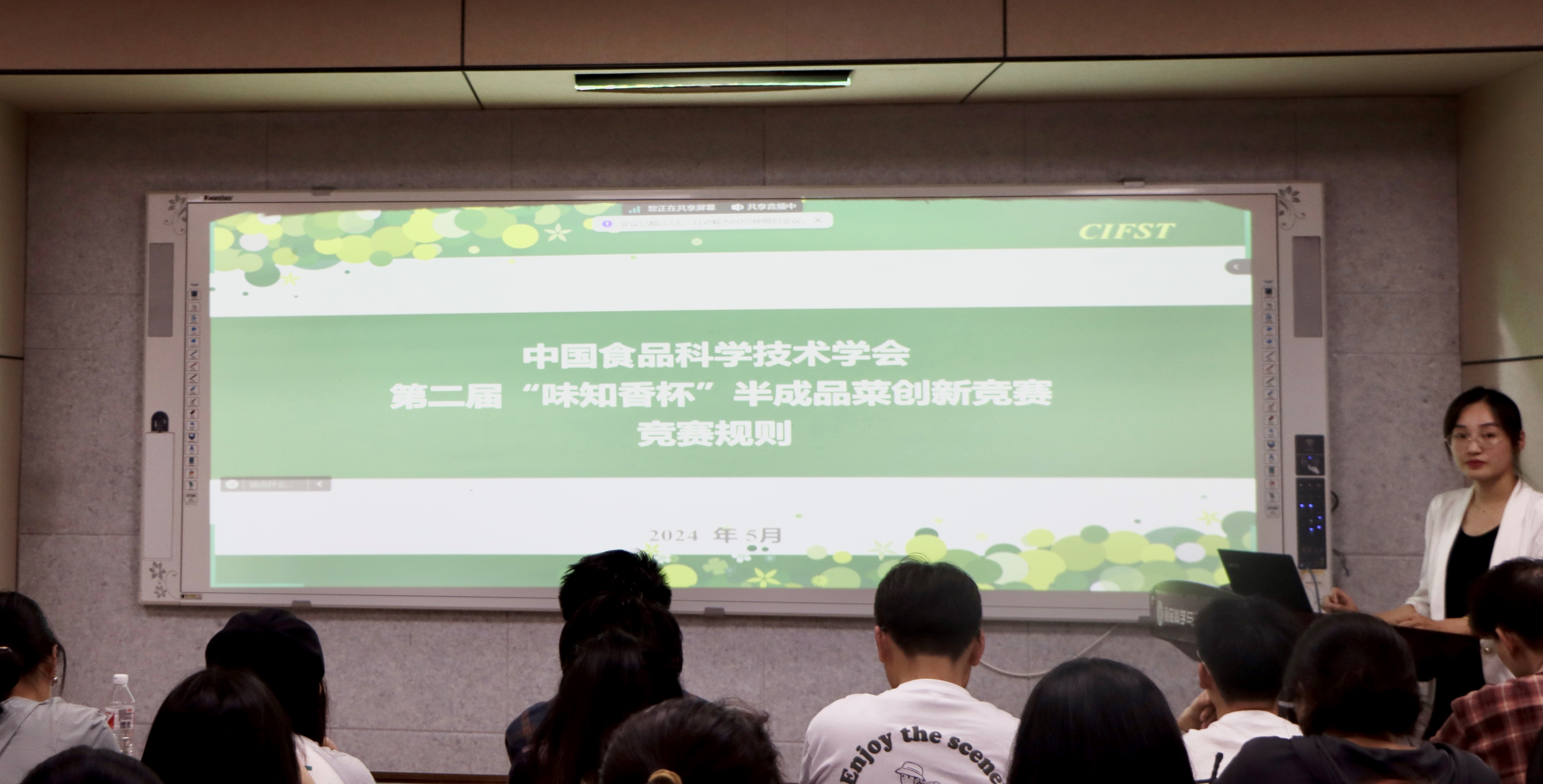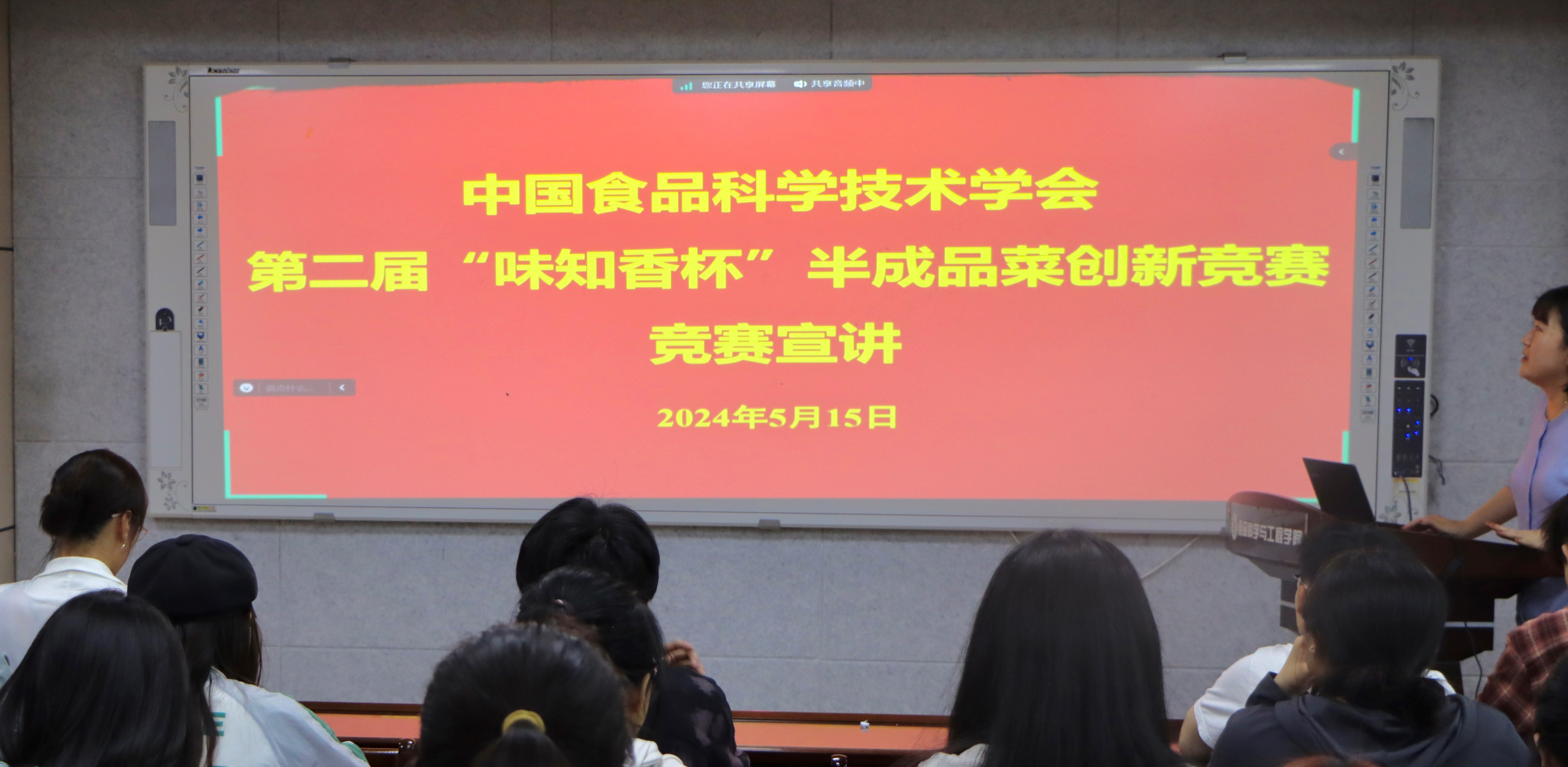 为响应国民营养计划,激发学生科研兴趣与创新潜能,帮助同学们深入了解“味知香杯”半成品菜创新比赛活动,5月15日,由中国食品科学技术学会、味之香股份有限公司主办的大学生创新食品竞赛校园宣讲会于食品楼302召开,邀请中国食品科学技术学会成员王妍做宣讲,活动由学院辅导员李振荣主持。