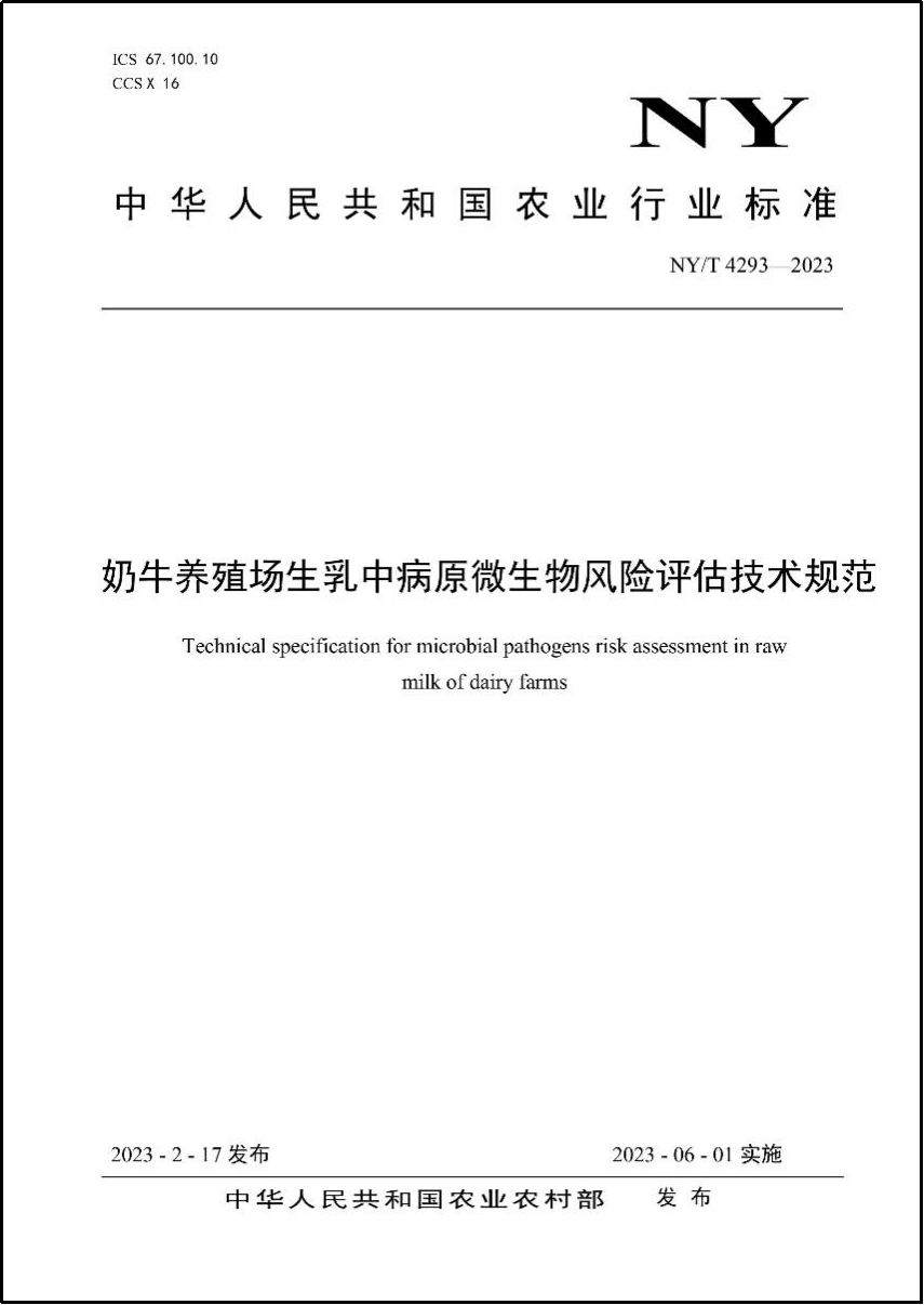 近日,由食品学院都启晶老师等作为主要完成人承担的国家农业行业标准《奶牛养殖场生乳中病原微生物风险评估技术规范》(NY/T 4293—2023)正式发布,2023年6月1日起实施。