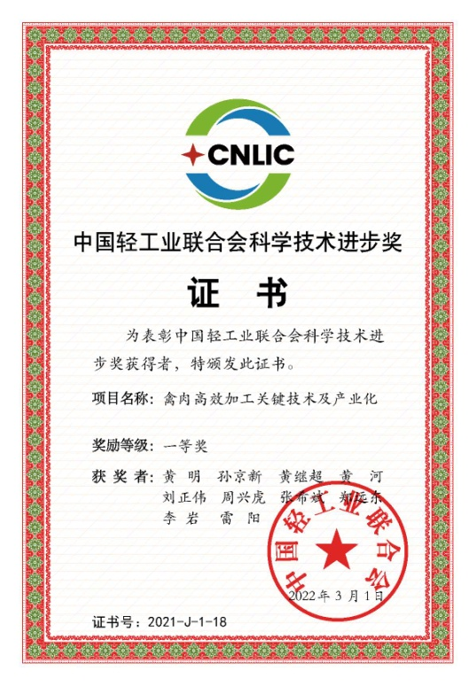 8月9日, 2021年中国轻工业联合会科学技术奖颁奖典礼在京举行,由beat365在线体育官网孙京新教授参与完成的“禽肉高效加工关键技术及产业化”项目,获得2021年度中国轻工业联合会科学技术进步奖一等奖。