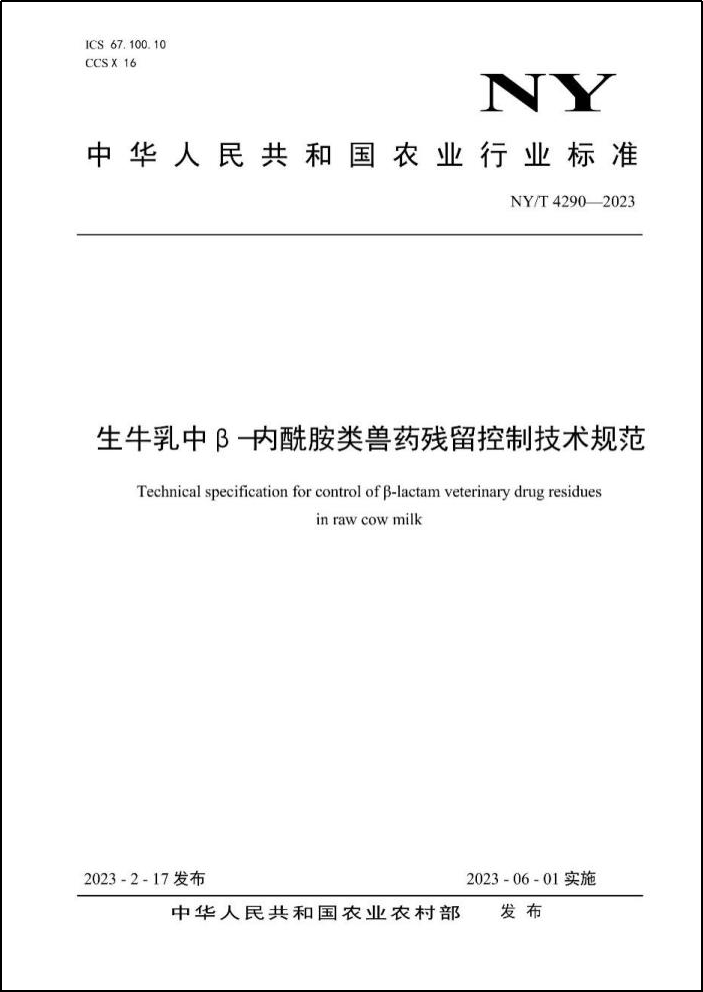 近日,由食品学院韩荣伟副教授等作为主要完成人承担的国家农业行业标准《生牛乳中β-内酰胺类兽药残留控制技术规范》(NY/T 4290—2023)正式发布,该标准将于今年6月1日起实施。