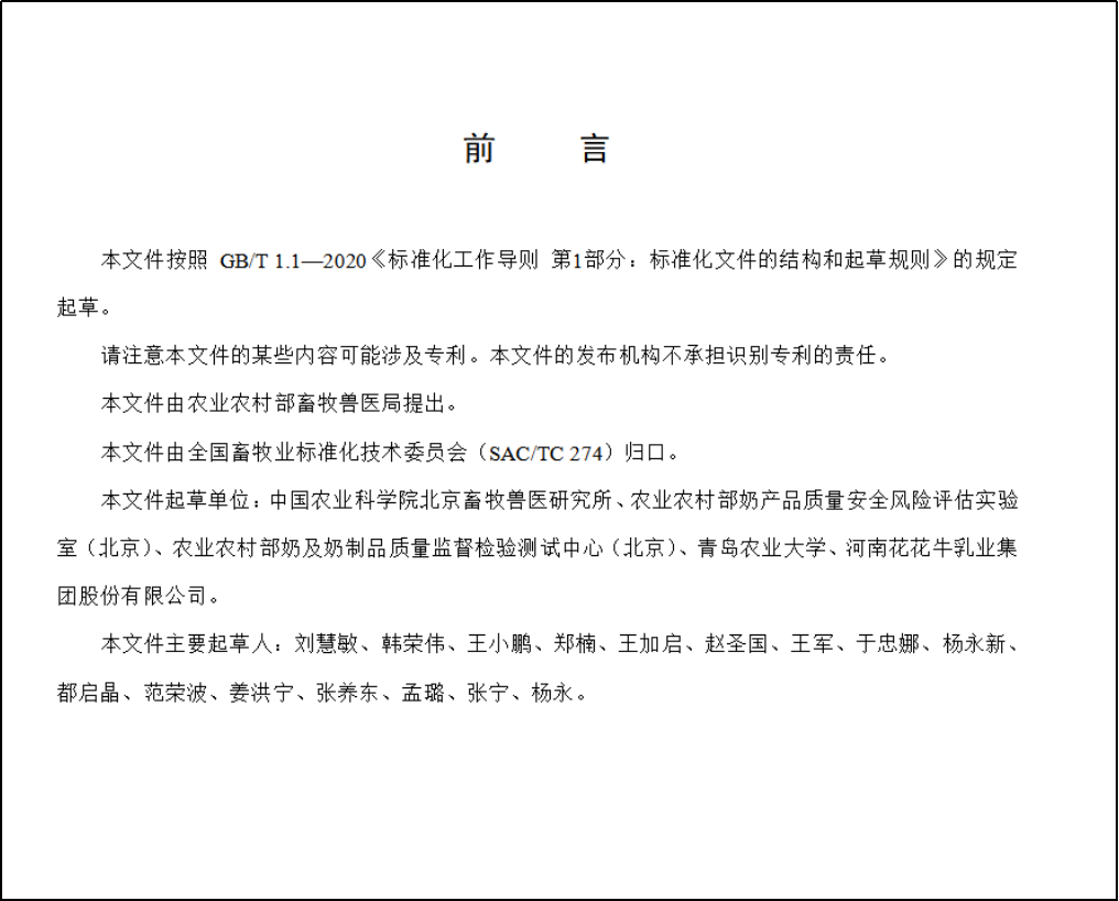 该标准由中国农业科学院北京畜牧兽医研究所奶业创新团队、农业农村部奶产品质量安全风险评估实验室(北京)、农业农村部奶及奶制品质量监督检验测试中心(北京)、青岛农业大学、河南花花牛乳业集团有限公司共同完成。