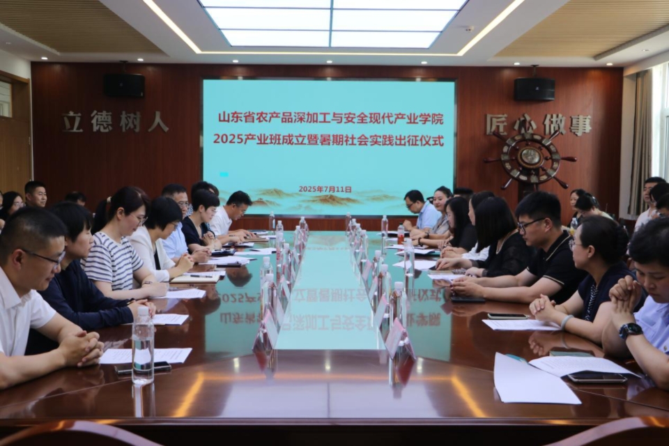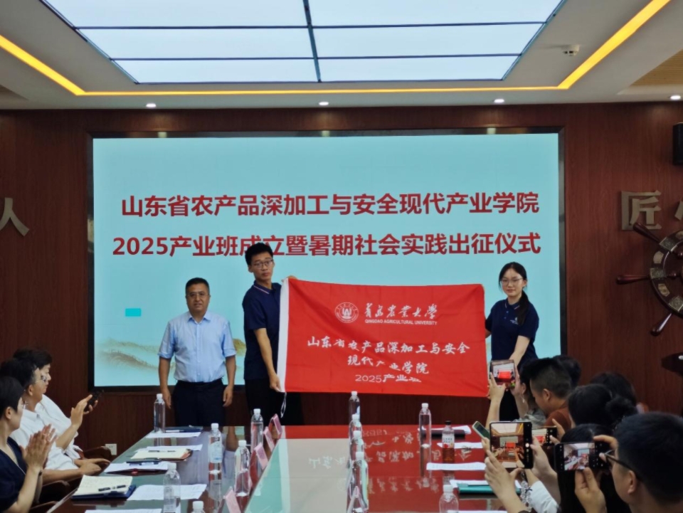 7月11日,山东省农产品深加工与安全现代产业学院2025产业班成立暨暑期实践出征仪式在食品楼举行。青岛市城阳区食品饮料产业协会秘书长黄柳以及青岛鑫复盛等14家企业负责人参加活动,学校党委委员、副校长孙庆杰出席仪式并讲话,学生工作处处长许颖、社会合作处副处长于宁、校团委副书记安金鹏以及教务处、beat365在线体育官网等单位有关负责人参加仪式。仪式由beat365在线体育官网党委书记车广杰主持。