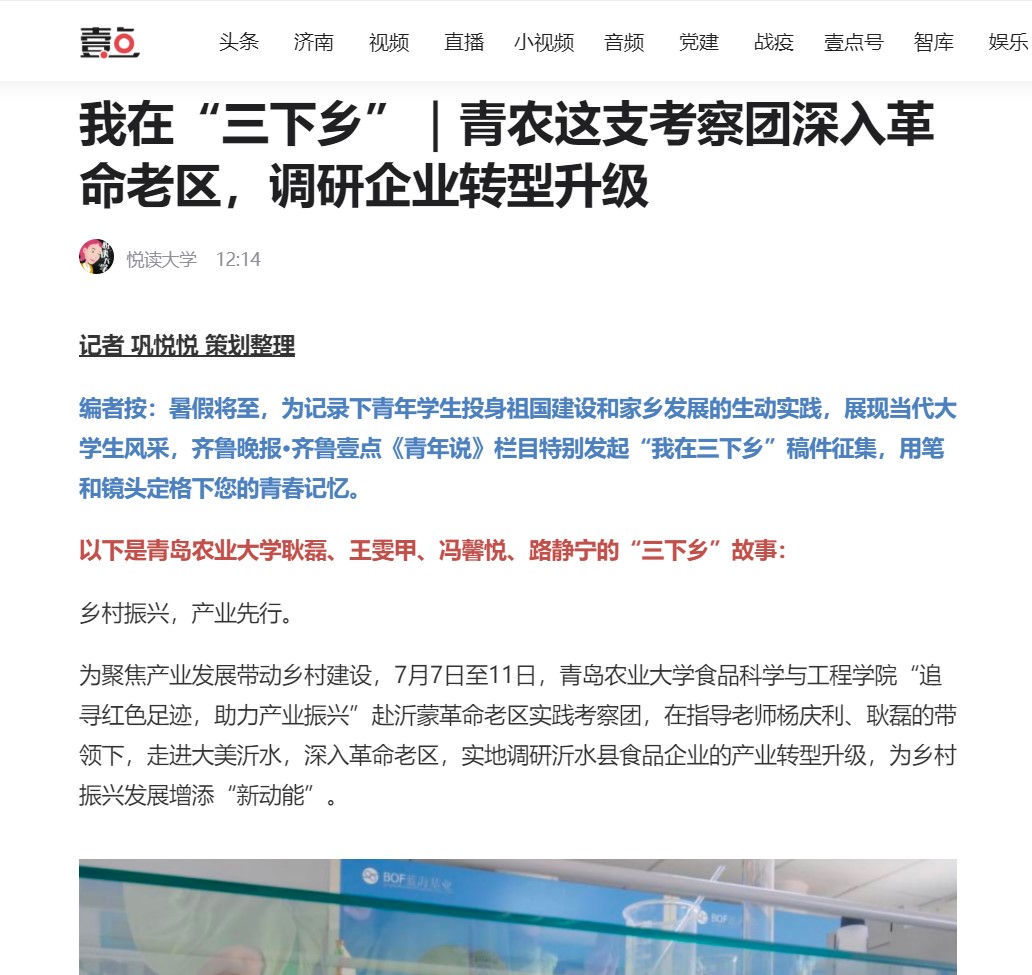 为聚焦产业发展带动乡村建设,7月7日至11日,beat365在线体育官网“追寻红色足迹,助力产业振兴”赴沂蒙革命老区实践考察团,在指导老师杨庆利、耿磊的带领下,走进大美沂水,深入革命老区,实地调研沂水县食品企业的产业转型升级,为乡村振兴发展增添“新动能”。