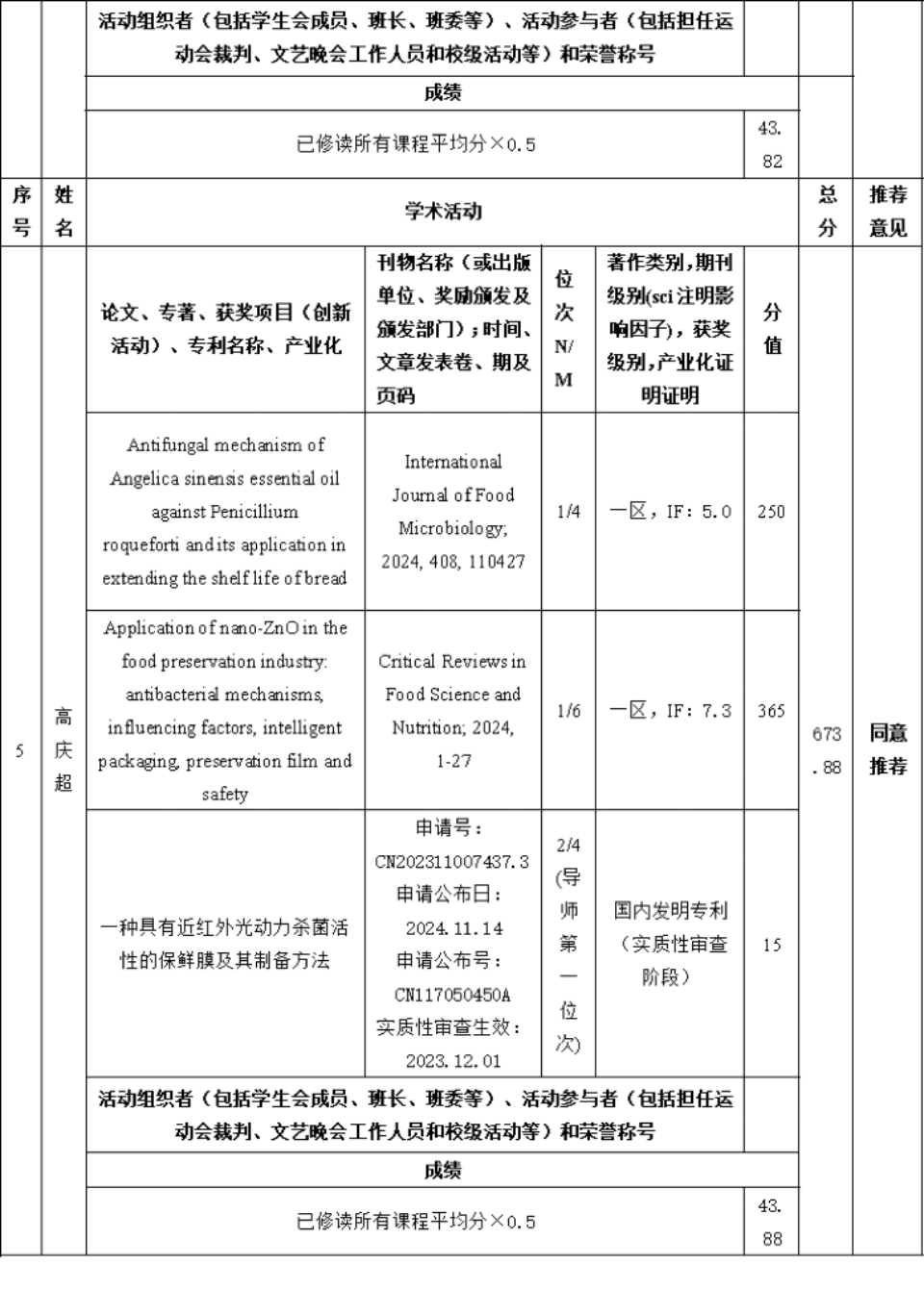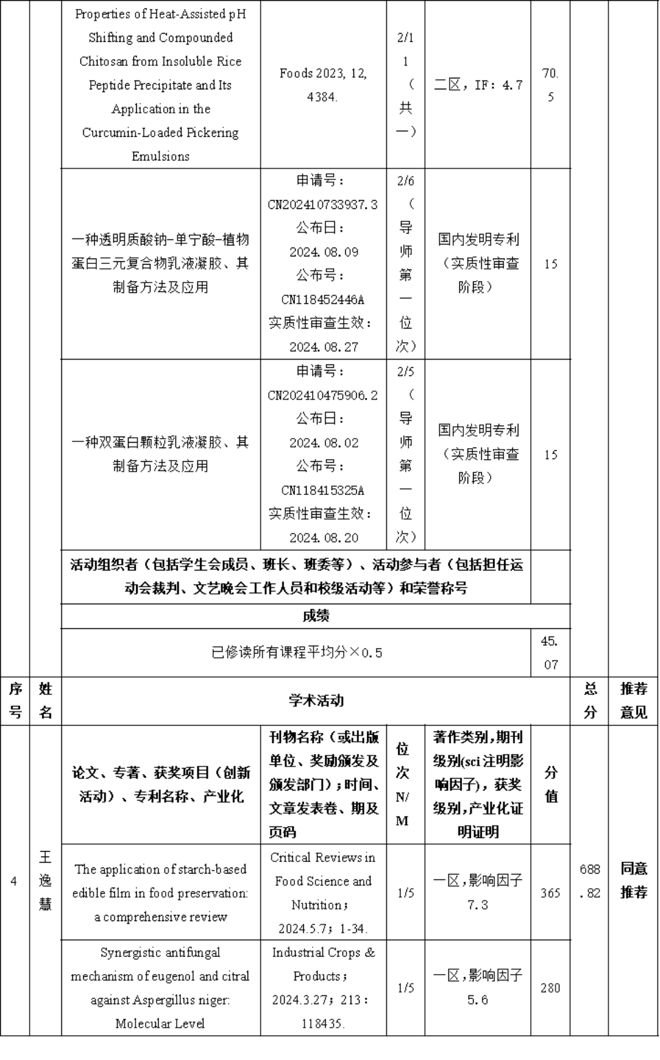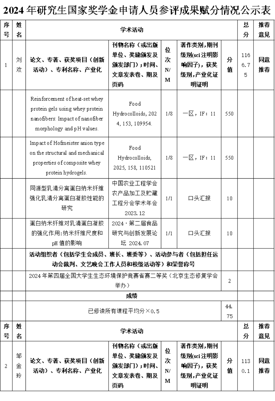 食品科学与工程一级学科硕士点2024年研究生国家奖学金推荐名单公示