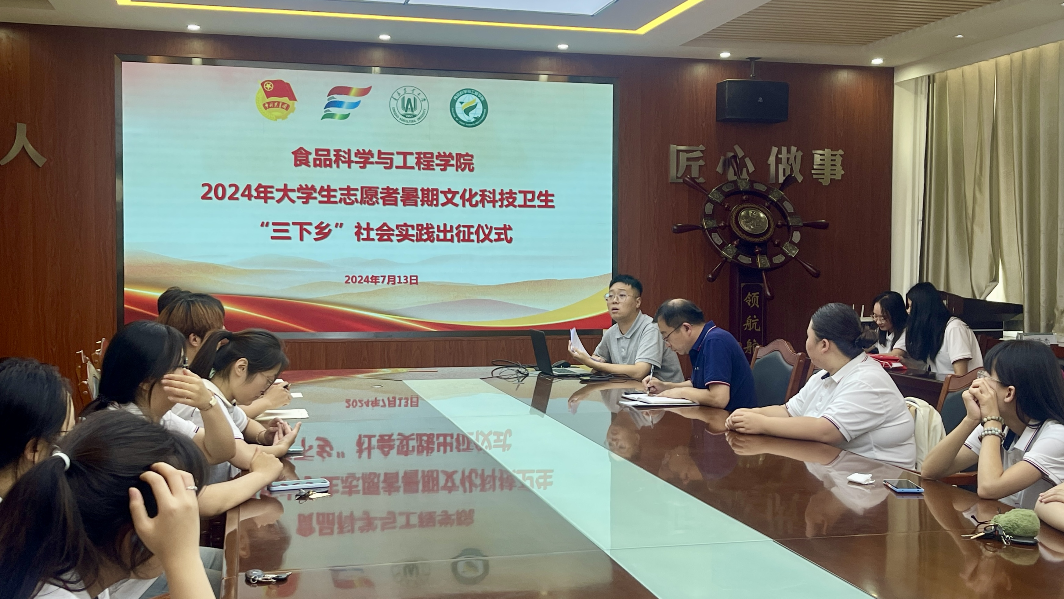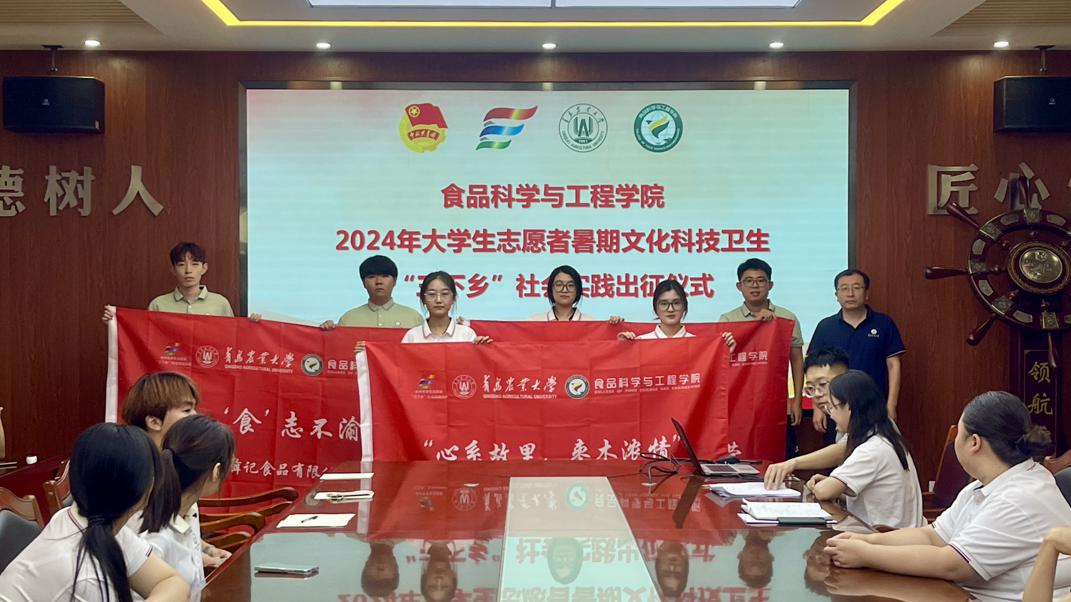 7月13日,beat365在线体育官网在食品楼举行2024年大学生志愿者暑期文化科技卫生“三下乡”社会实践出征仪式。学院党委副书记、副院长刘晓华,辅导员耿磊及各实践团队成员参加活动。