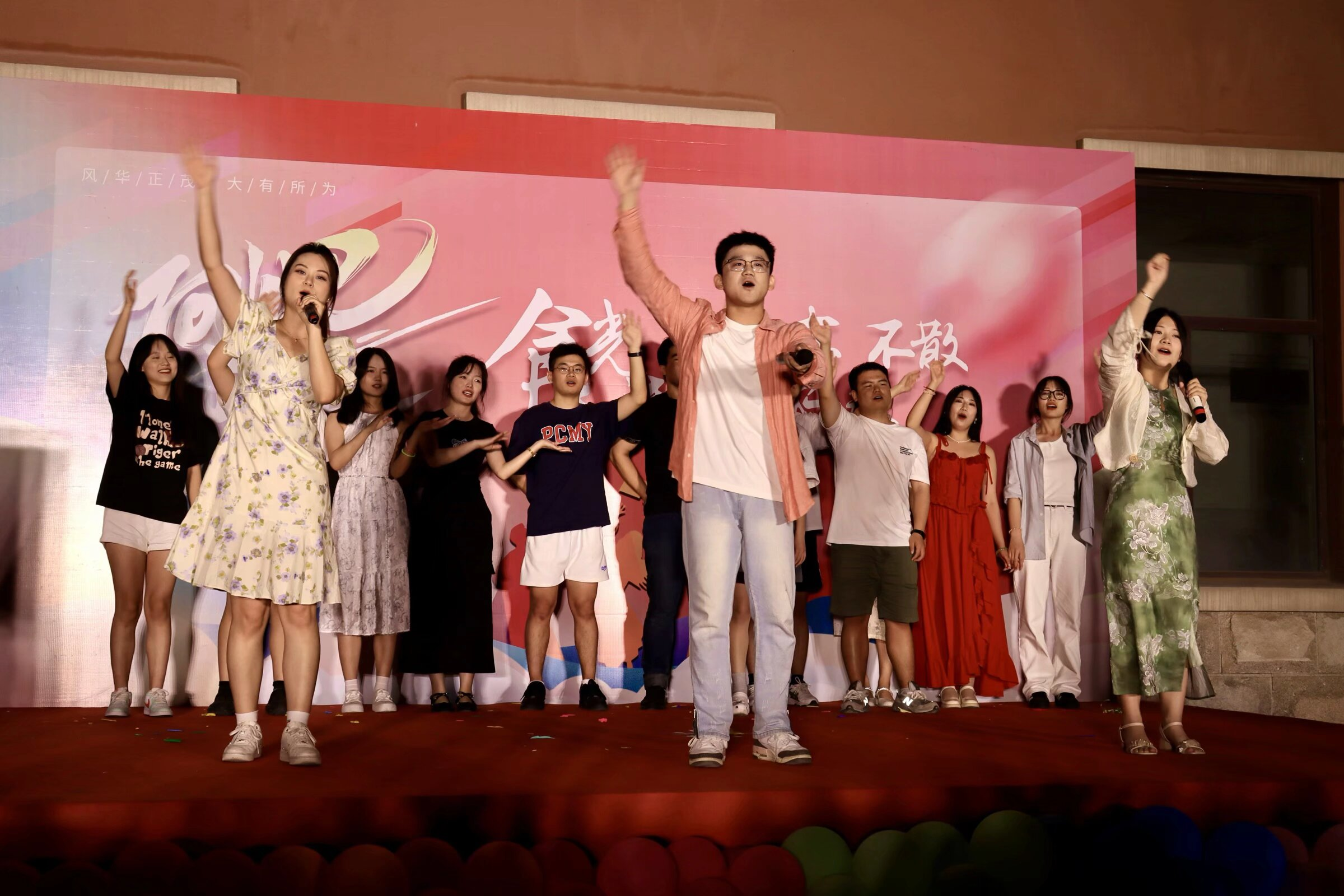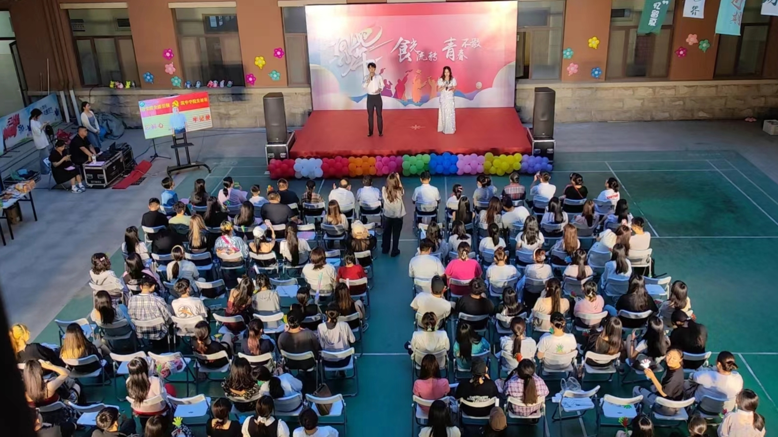 歌会内容丰富,形式多样,包括精彩的舞蹈表演、动人的歌曲演唱、富有趣味和挑战的互动游戏,激动人心的合唱环节以及感人的献花环节。用歌声串联起真挚深厚的母校情、父母恩、师生谊、同学缘唱响了跨越时光的青春之歌。歌曲引发毕业生们的共鸣,大家挥舞着手中的荧光棒,跟随着音乐的律动尽情舞动,灯光、音乐、掌声、喝彩声相互交映,点亮夜空。全场合唱的《凤凰花开的路口》将歌会推向了高潮,同学们用歌声表达了对母校的深深眷恋和对未来的美好憧憬。