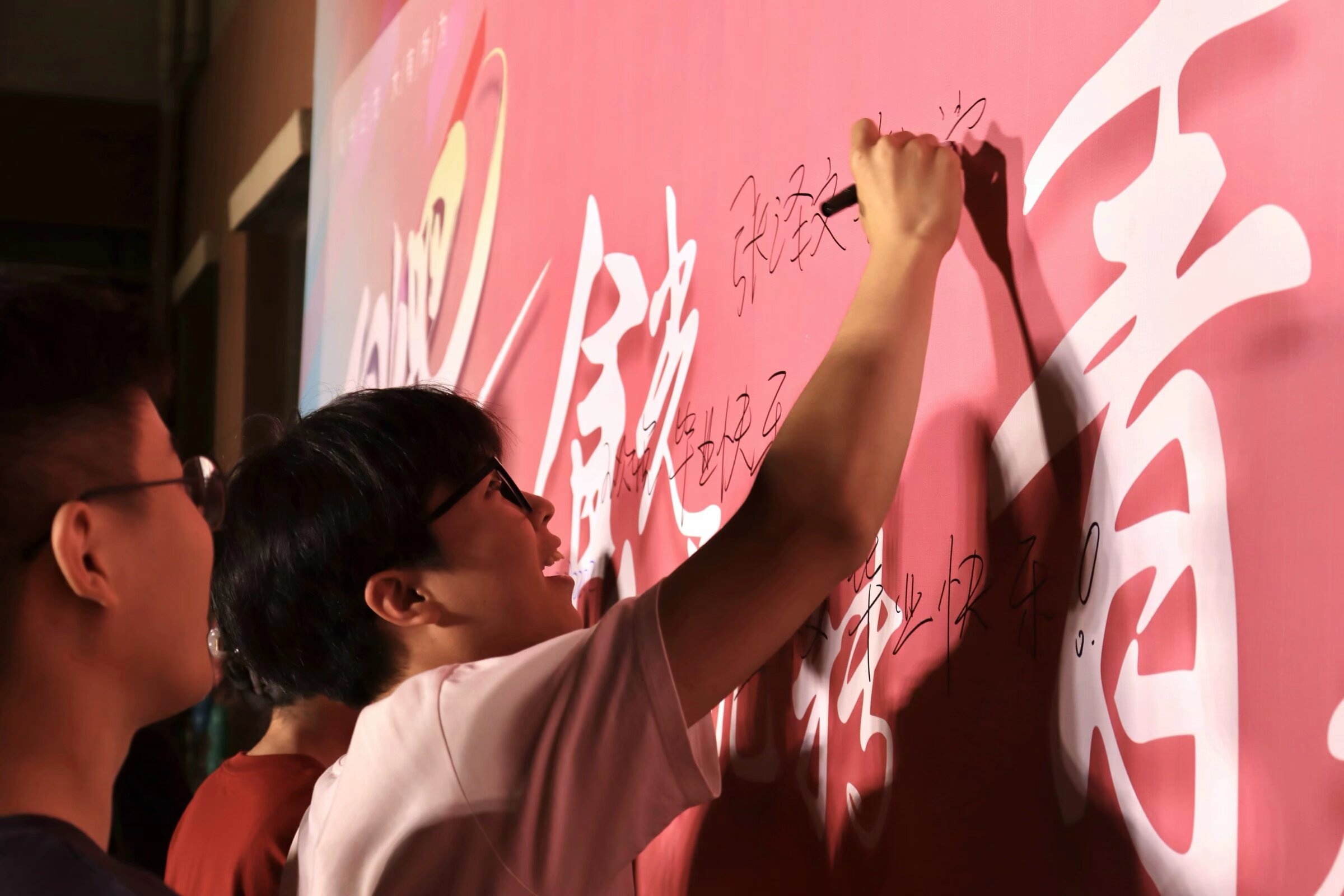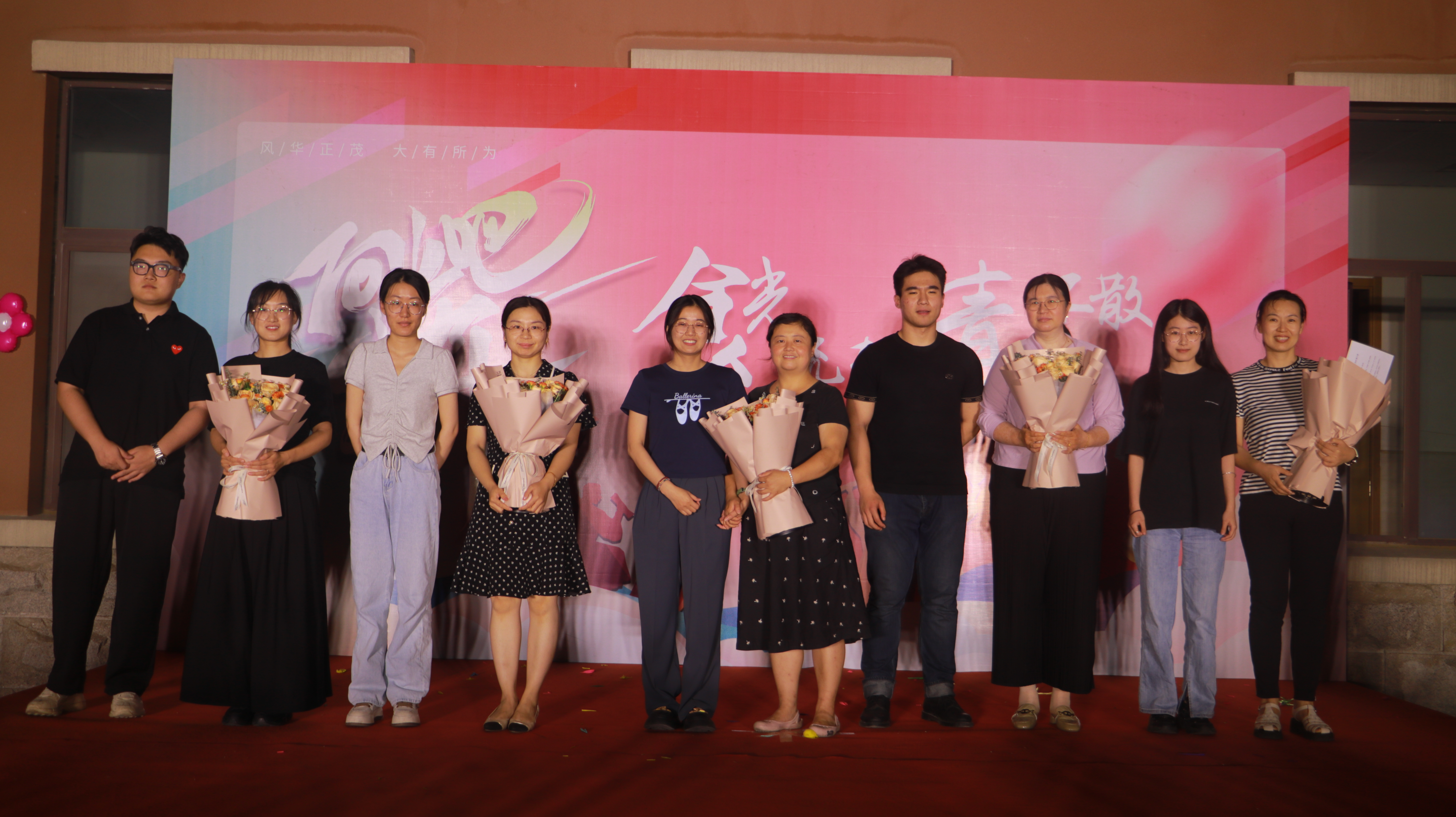 歌会最后,毕业班同学为班主任献花,并在幕布上写下来毕业感言。