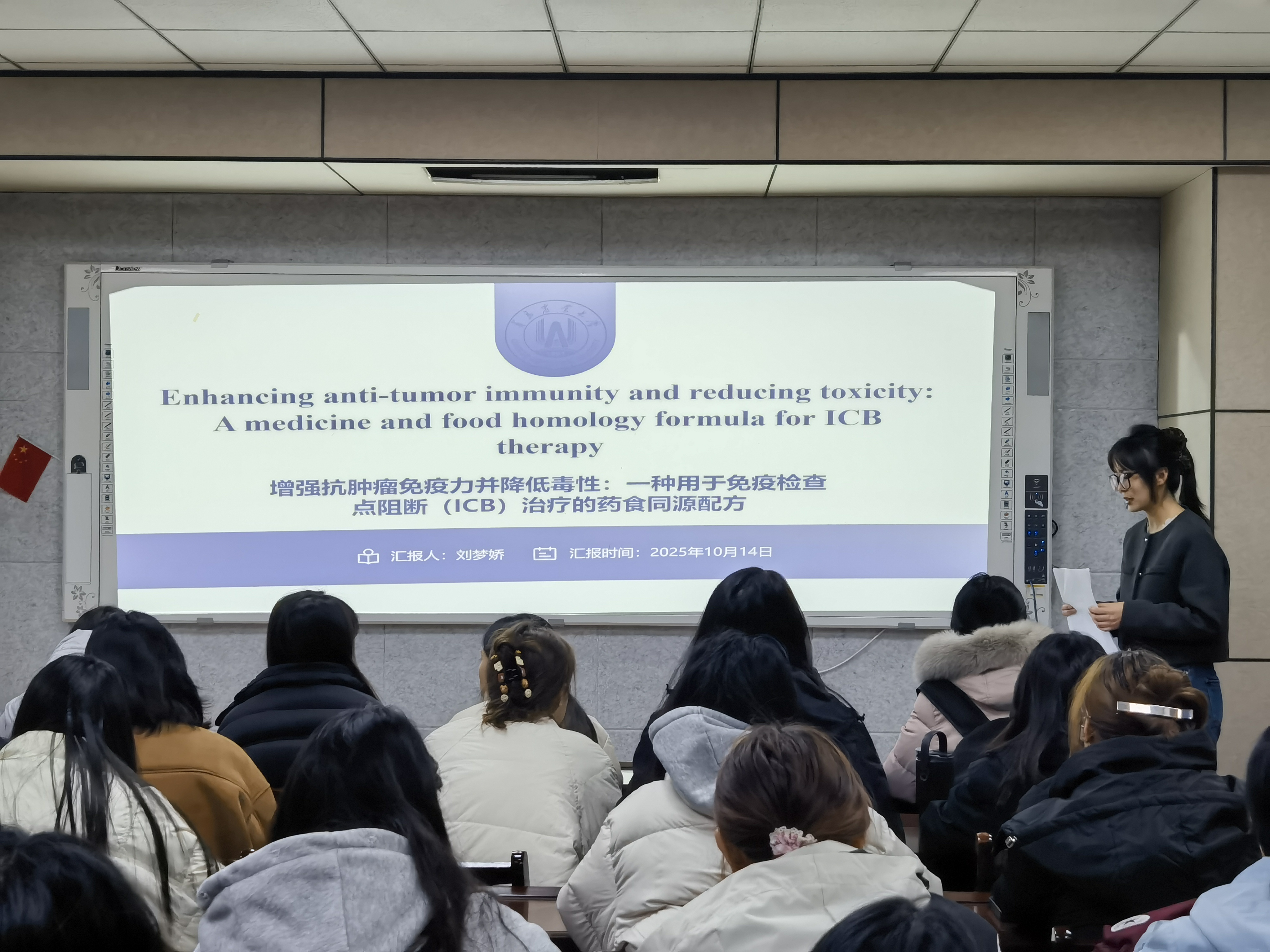 11月20日,食品学院在食品楼302举办第五十七期“食学研讲”活动。此次活动由食品硕2503班刘梦娇主讲,主题为“增强抗肿瘤免疫力并降低毒性:一种用于免疫检查点阻断(ICB)治疗的药食同源配方”。