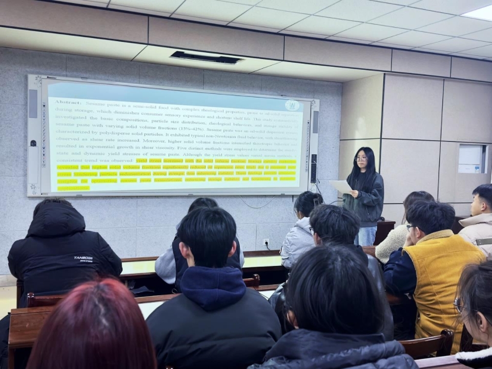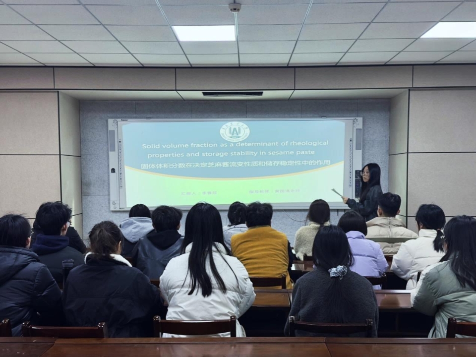 3月27日,食品学院在食品楼302举办第四十期“食学研讲”活动。本次活动由食品加工与安全专业23级研究生李雅欣主讲,主题为“固体体积分数在决定芝麻酱流变性质和储存稳定性中的作用”。报告聚焦基于CT灰度分析的稳定性评估方法,为在场同学解析了相关领域的研究进展。