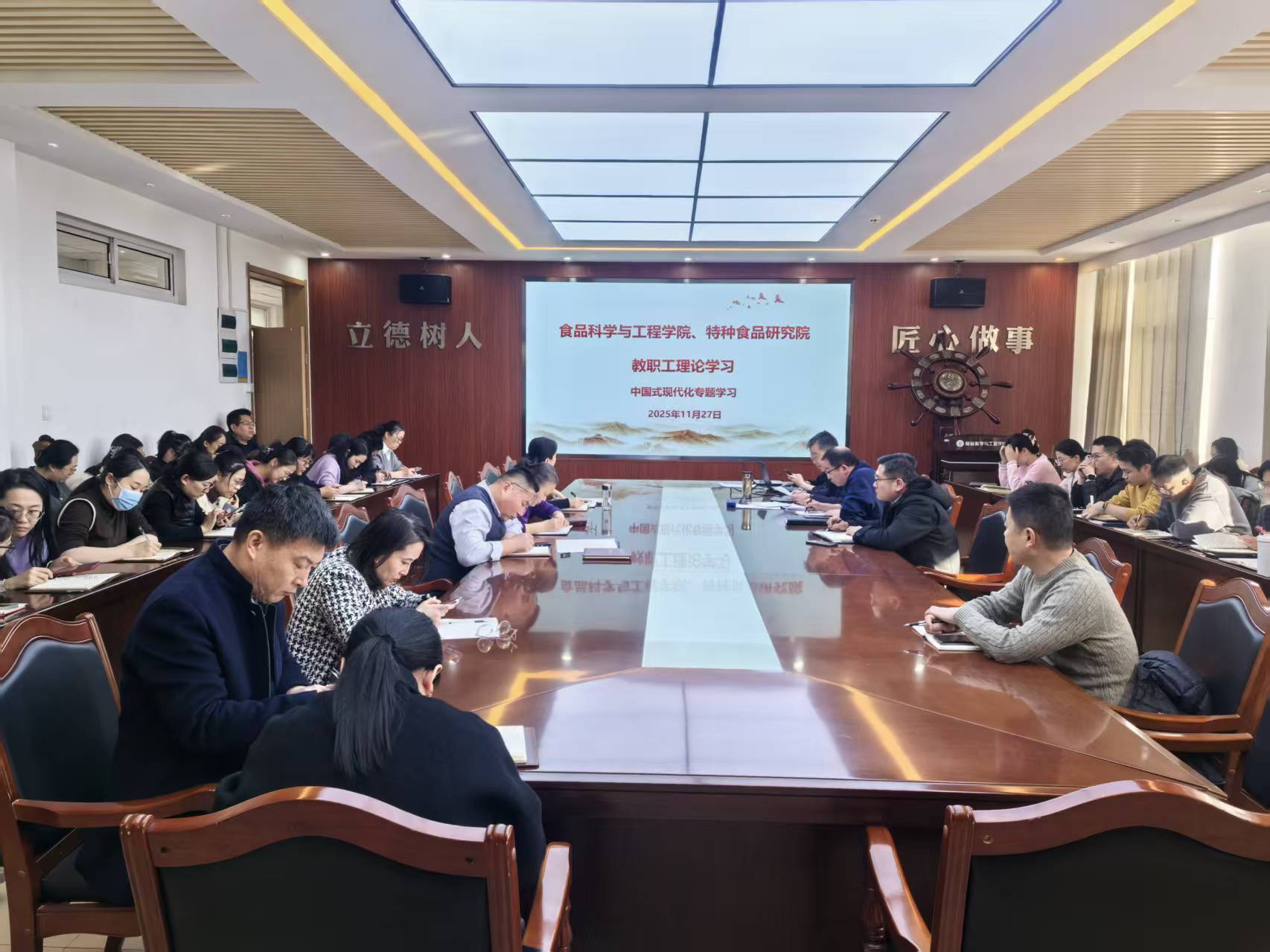 11月27日,beat365在线体育官网、特种食品研究院召开全体教职工理论学习会议,围绕中国式现代化进行专题学习,会议由学院党委书记车广杰主持,全体教职工参加。